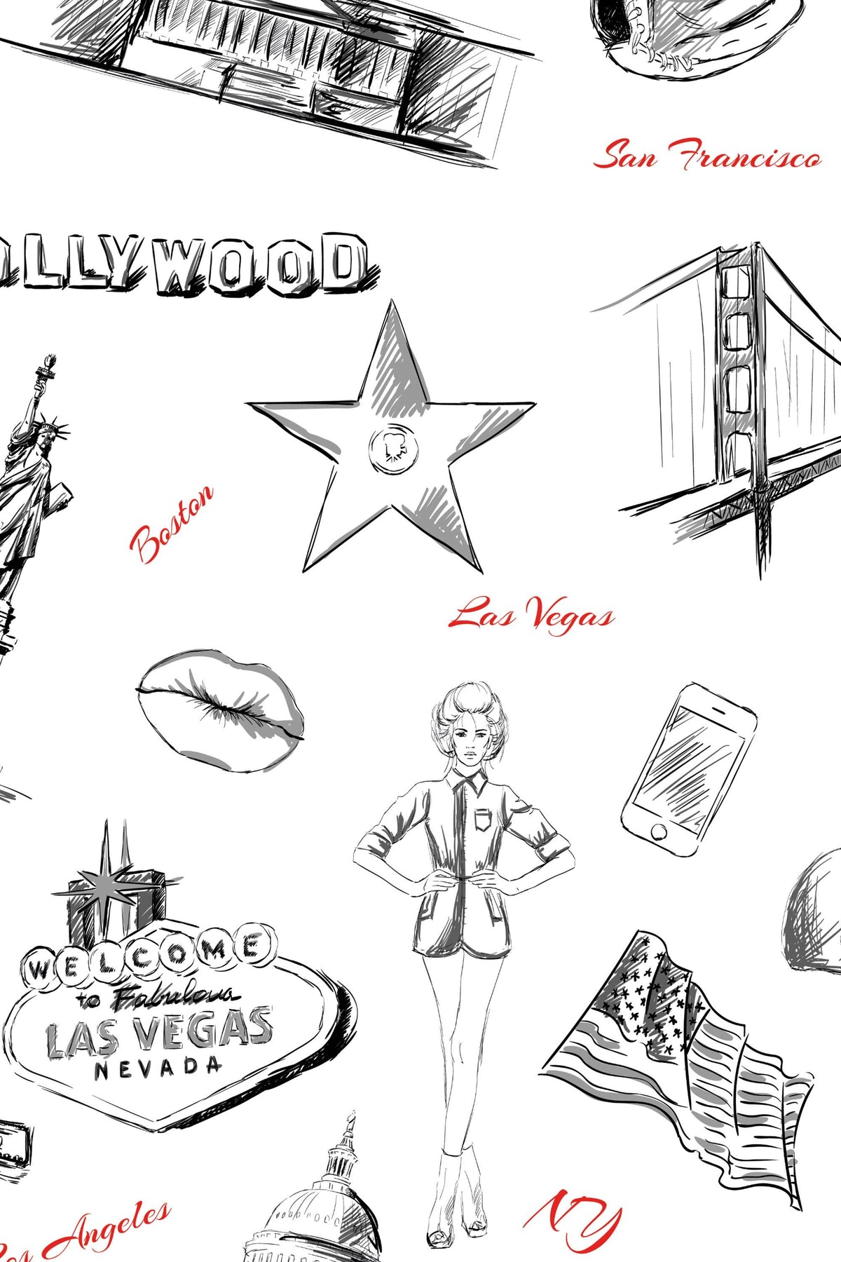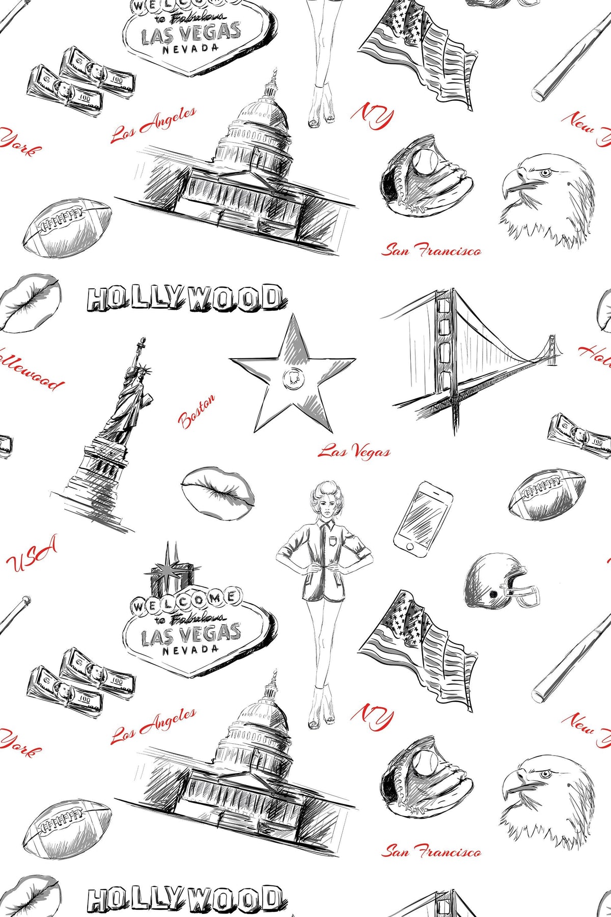 This wallpaper features hand-drawn American icons, including landmarks, symbols, and retro sketches. The playful black-and-white illustration style adds character and personality to any space, making it perfect for kids’ rooms, playrooms, studios, and creative interiors.