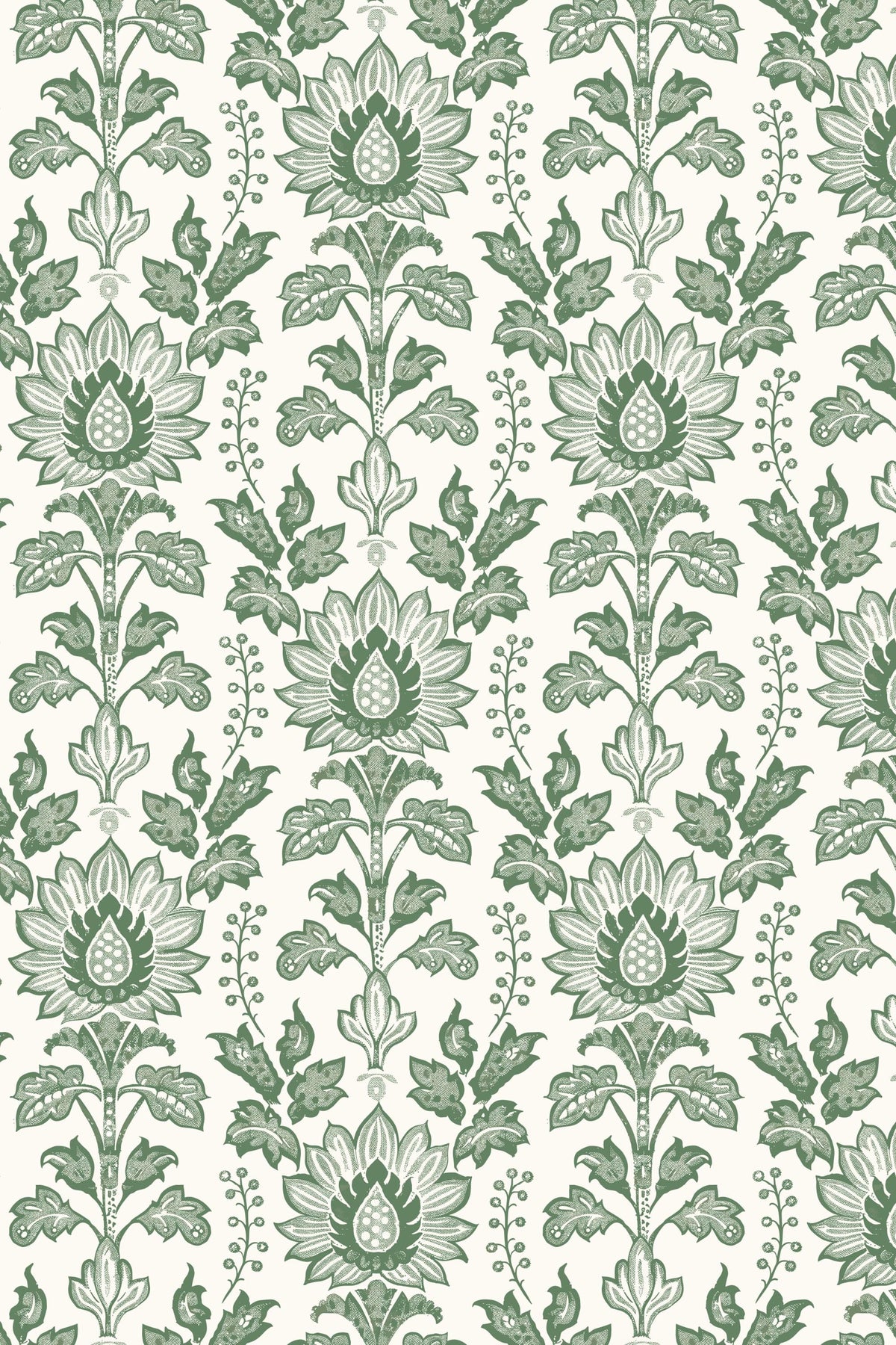 This wallpaper showcases a classic botanical design inspired by traditional Indian block prints. The deep green floral pattern adds elegance and depth, making it a beautiful choice for bedrooms, living areas, accent walls and etc.