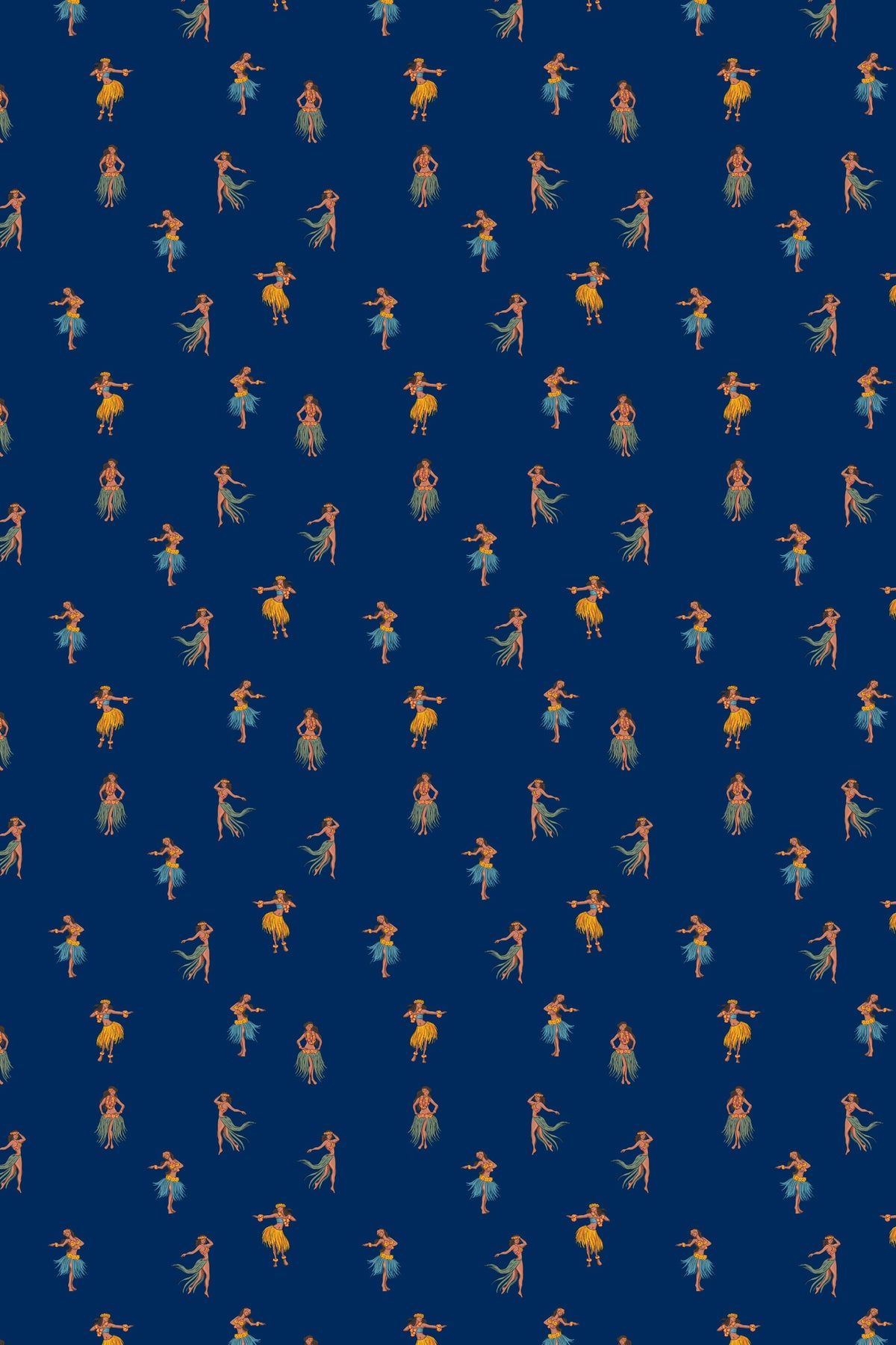 Bring island magic to your space with this bold Hawaiian dancer wallpaper. Vintage-style hula figures sway gracefully against a deep navy night sky. Bright grass skirts in yellow and teal add tropical energy and charm. Perfect for feature walls, beach house interiors, or retro-inspired decor. This seamless design captures the rhythm and romance of a warm island night.