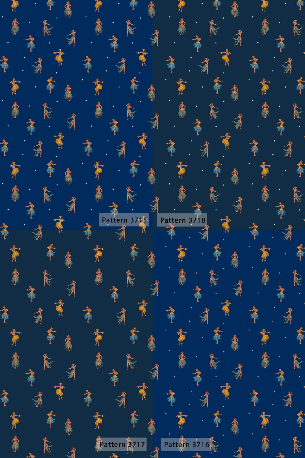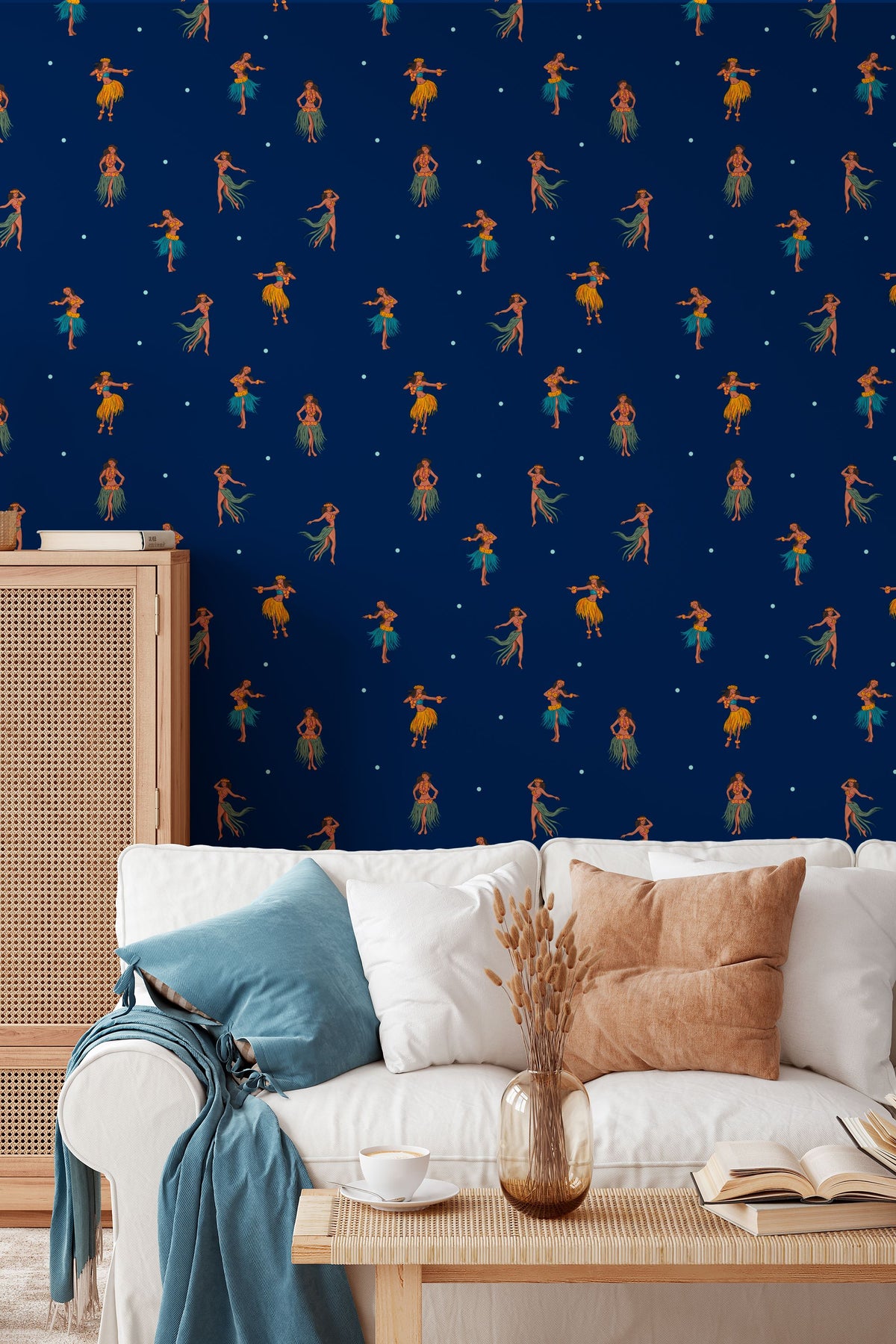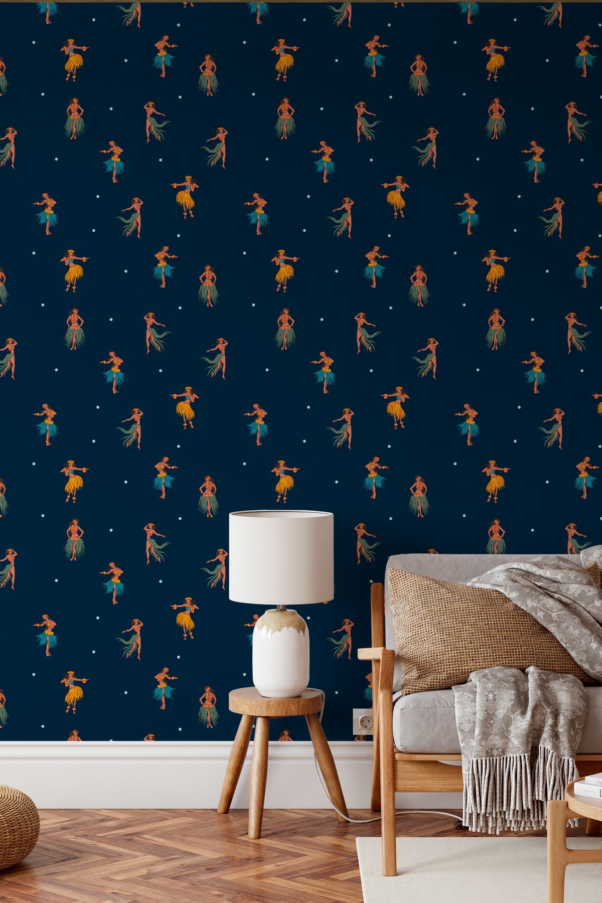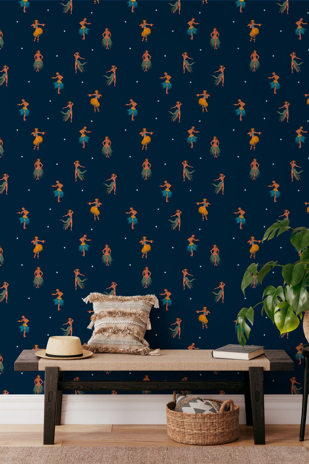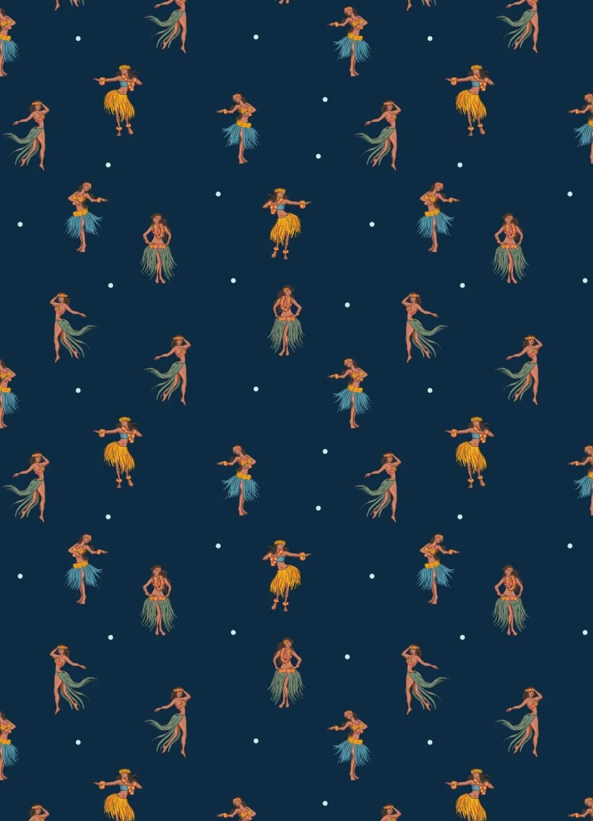 The Hawaiian dancer wallpaper brings a vintage hula design to your space, featuring graceful figures dancing under a navy night background. This tropical wallpaper offers a retro tropical decor vibe with eco friendly wallpaper materials that combine style and sustainability. Printed with advanced latex printed wallpaper technology, it delivers vibrant colors and long-lasting durability on a canvas texture wallpaper surface.
