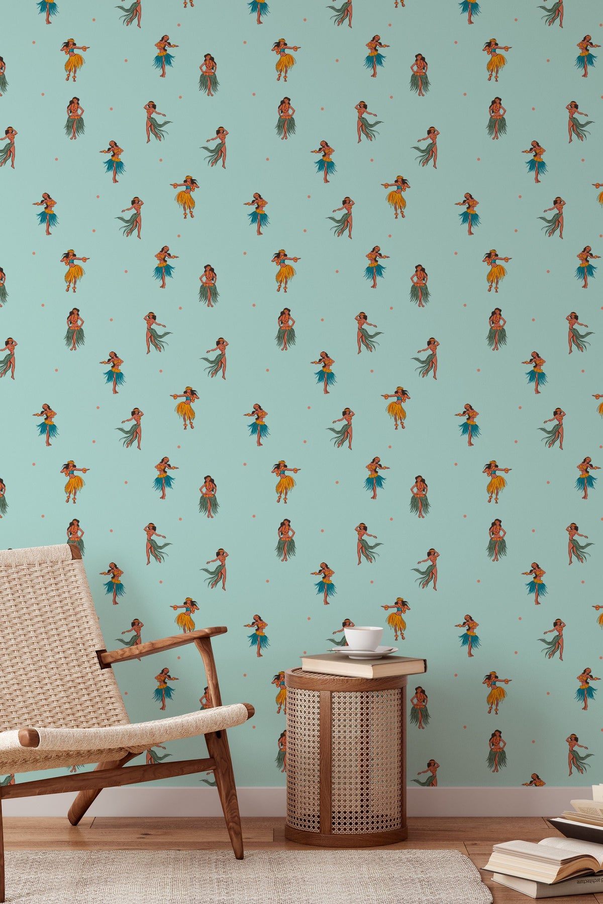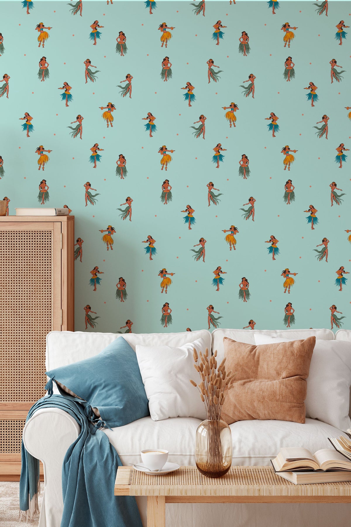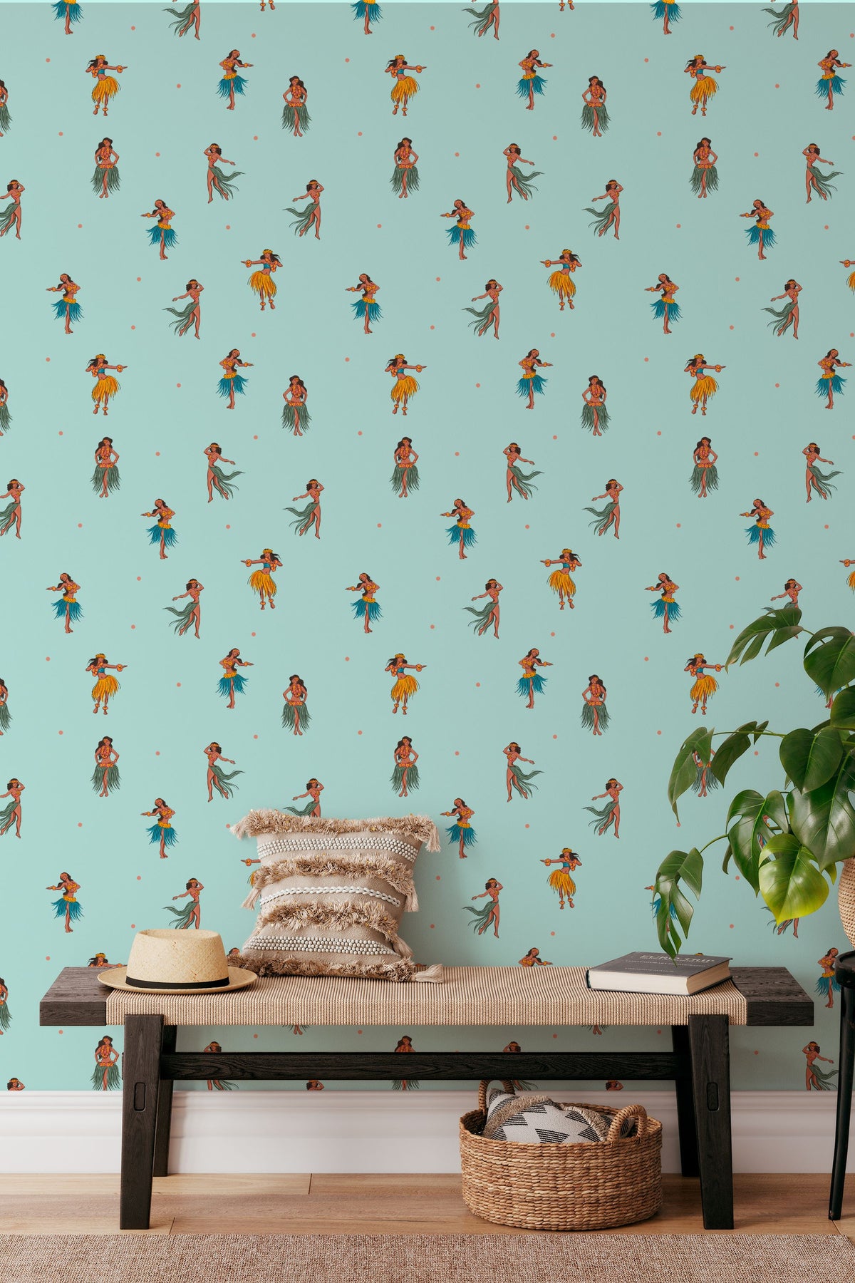 Vintage Hawaiian hula dancers sway joyfully across a cool mint background. Vibrant grass skirts in yellow and teal add playful tropical energy. Retro-inspired illustrations evoke carefree beachside fun and nostalgia. Ideal for coastal interiors, tiki bars, or lively summer spaces. This seamless wallpaper design radiates island vibes with fresh, breezy charm.