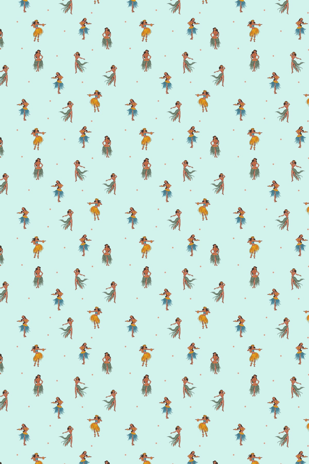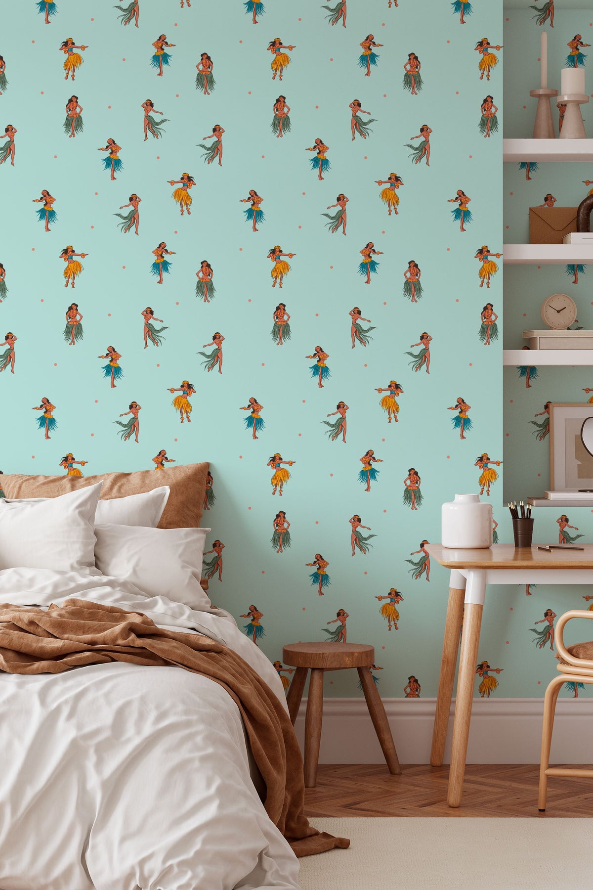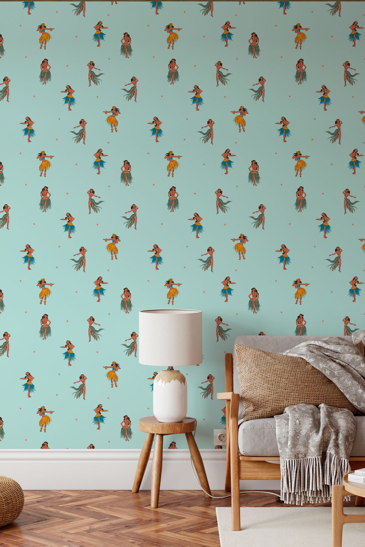 Vintage Hawaiian hula dancers sway joyfully across a cool mint background. Vibrant grass skirts in yellow and teal add playful tropical energy. Retro-inspired illustrations evoke carefree beachside fun and nostalgia. Ideal for coastal interiors, tiki bars, or lively summer spaces. This seamless wallpaper design radiates island vibes with fresh, breezy charm.