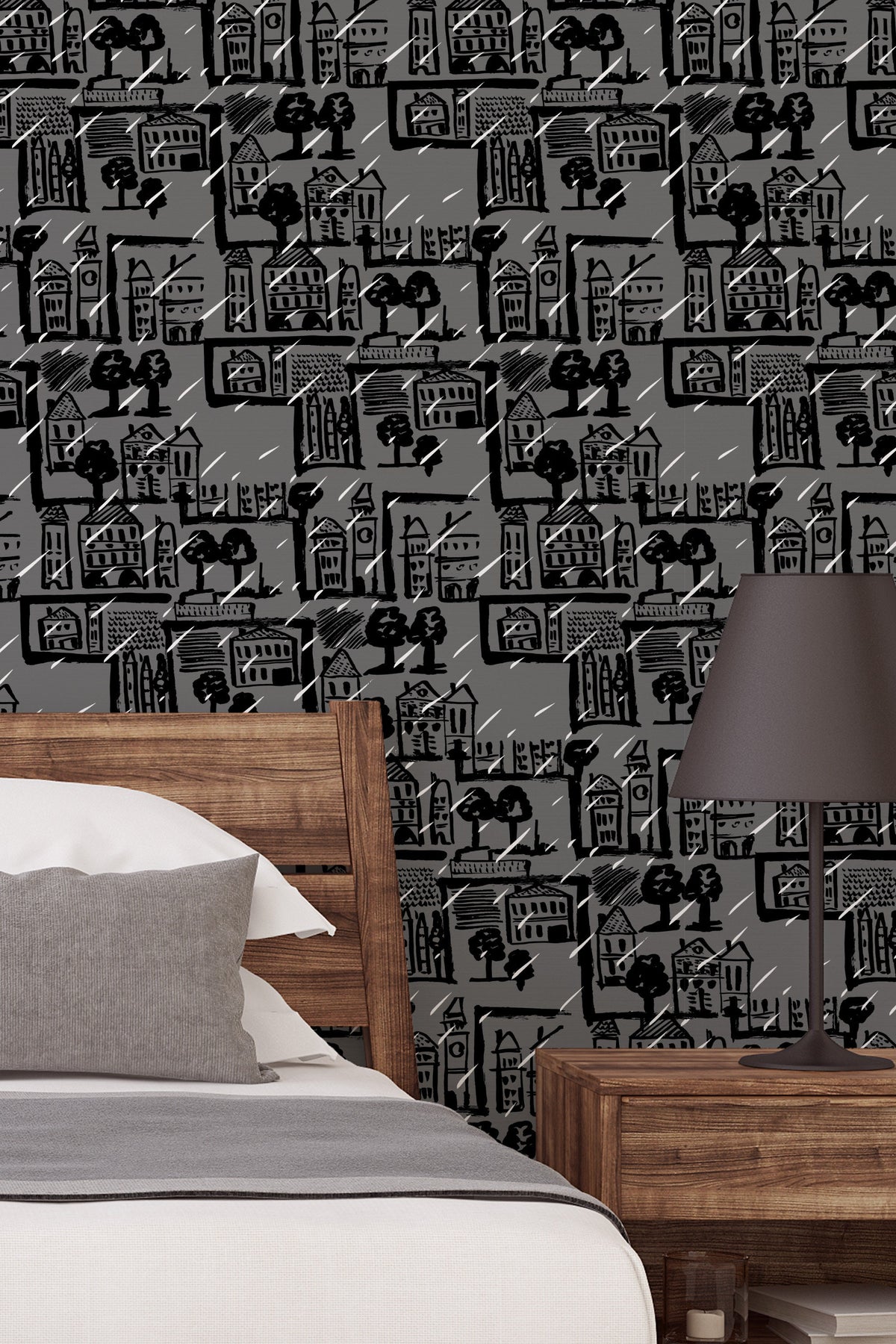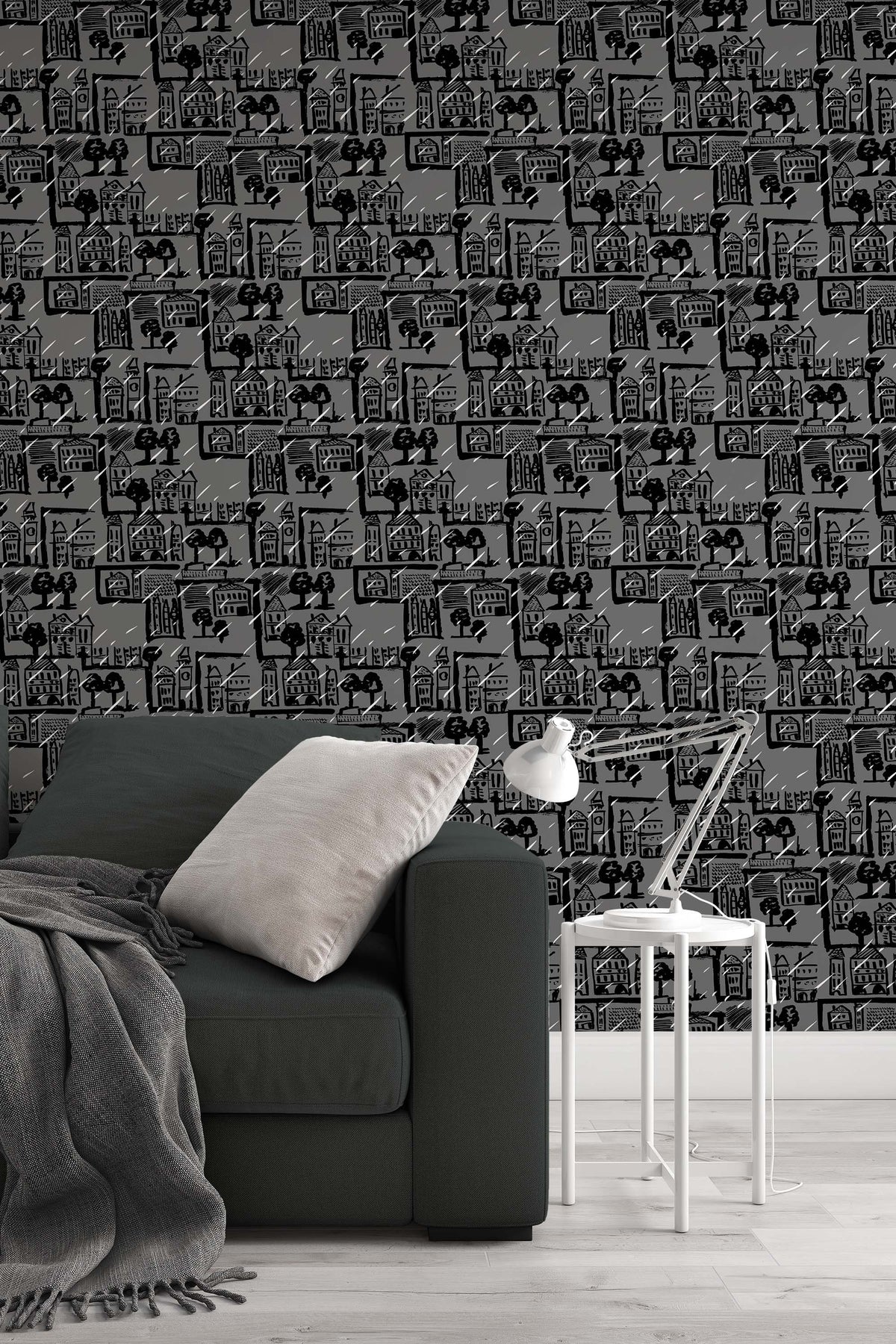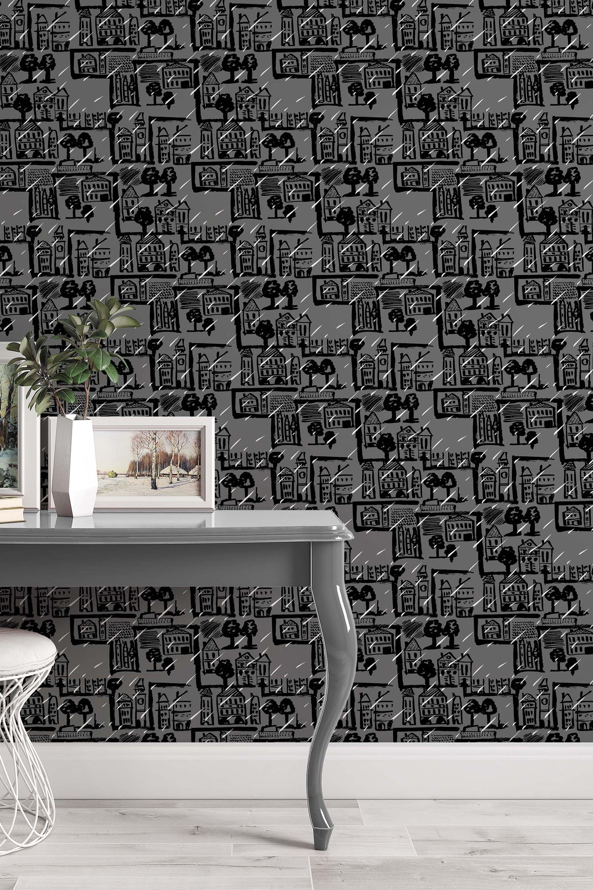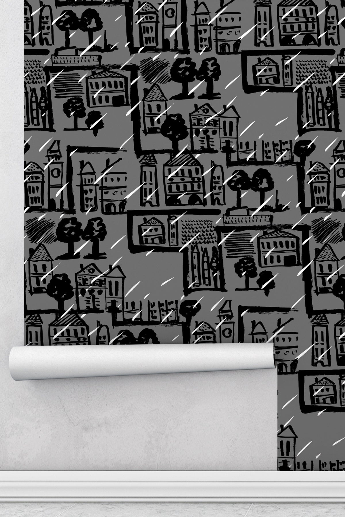 TModern wallpaper featuring a bold black and grey sketch of city houses, trees, and rain lines. Perfect for an accent wall in a bathroom, powder room, entryway, or any contemporary minimalist or loft-style interior.