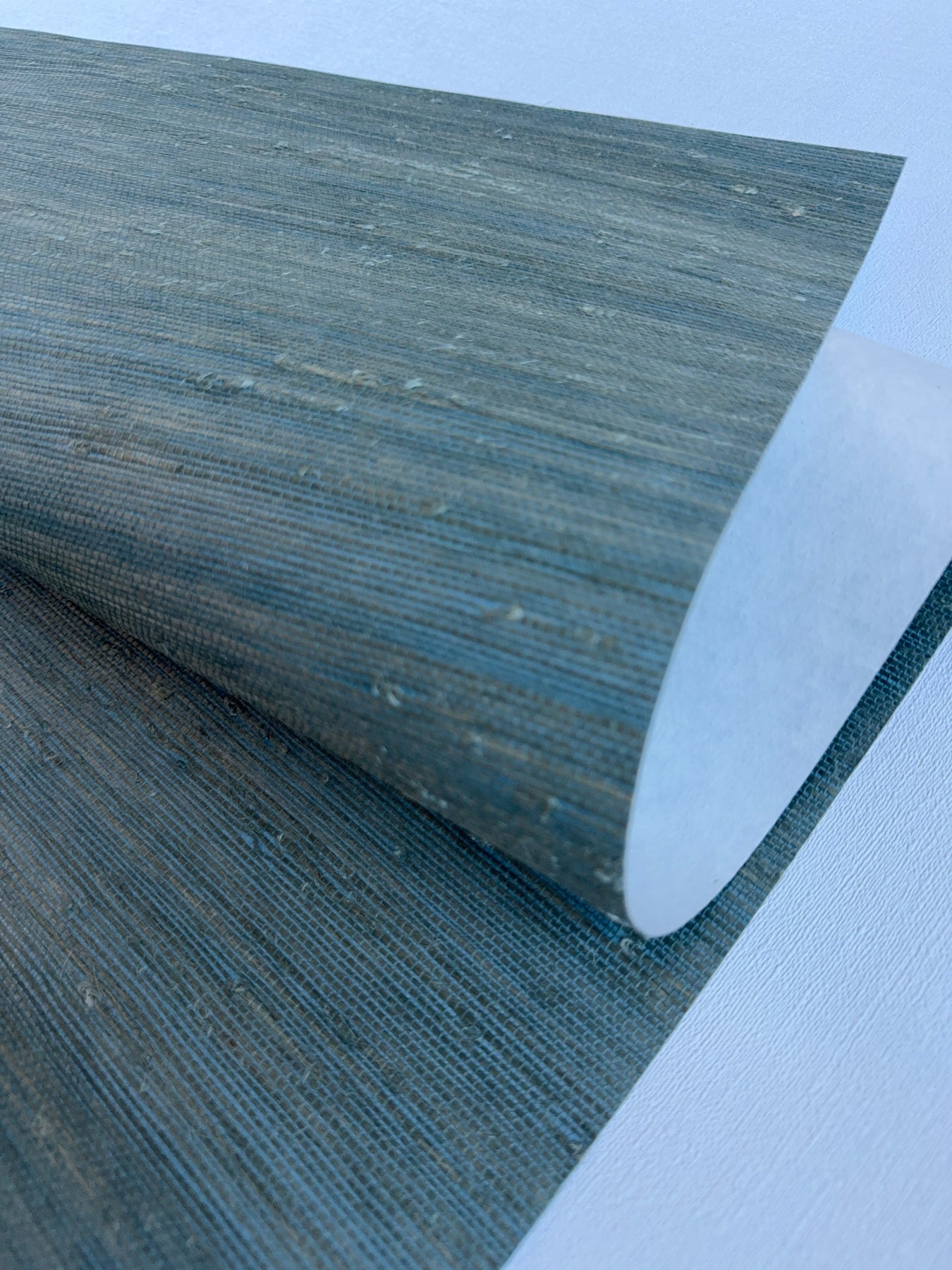 Handwoven Super Hemp 42121 natural grasscloth wallpaper in muted blue green, close-up showing horizontal weave and natural fiber knots