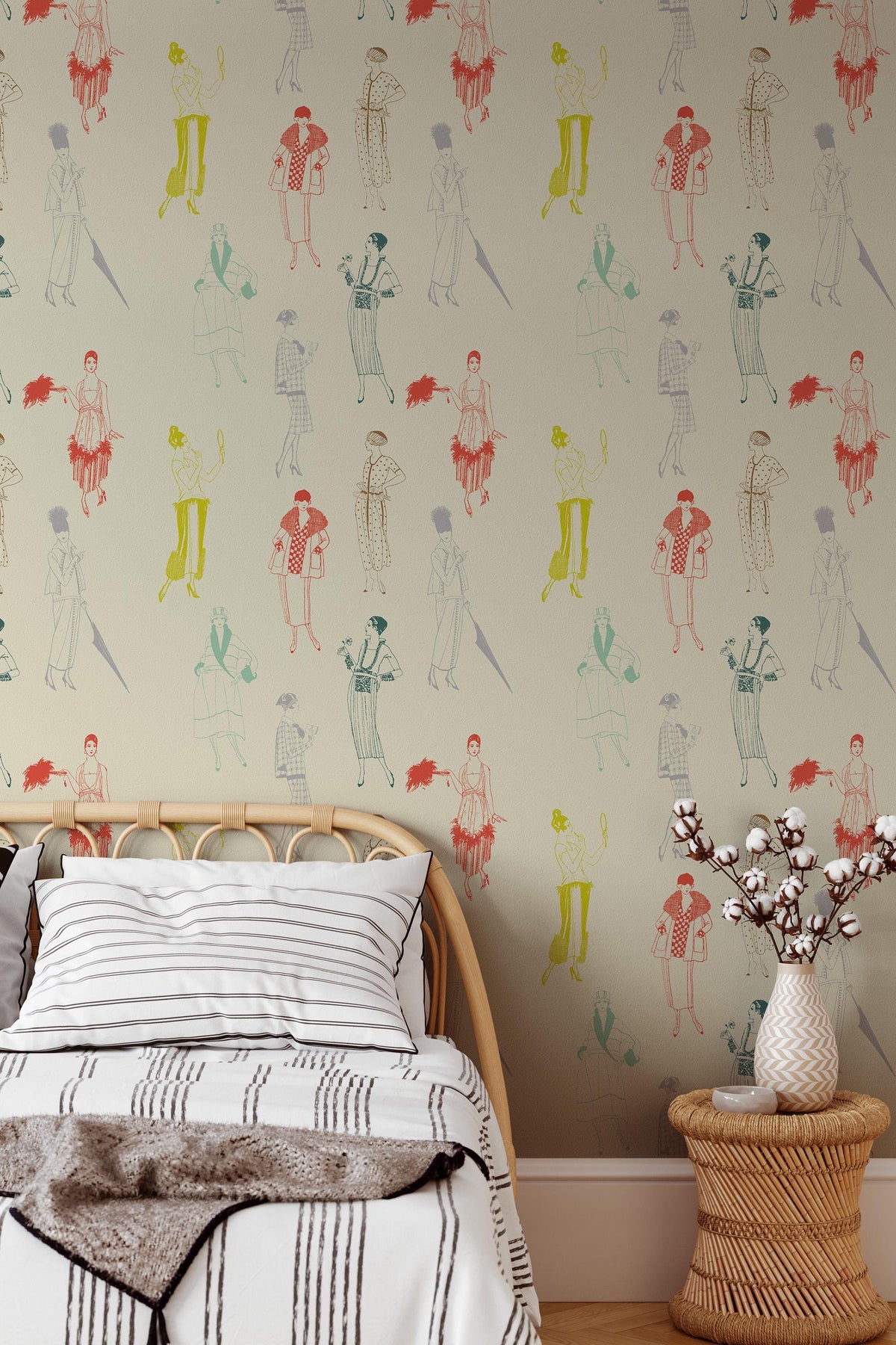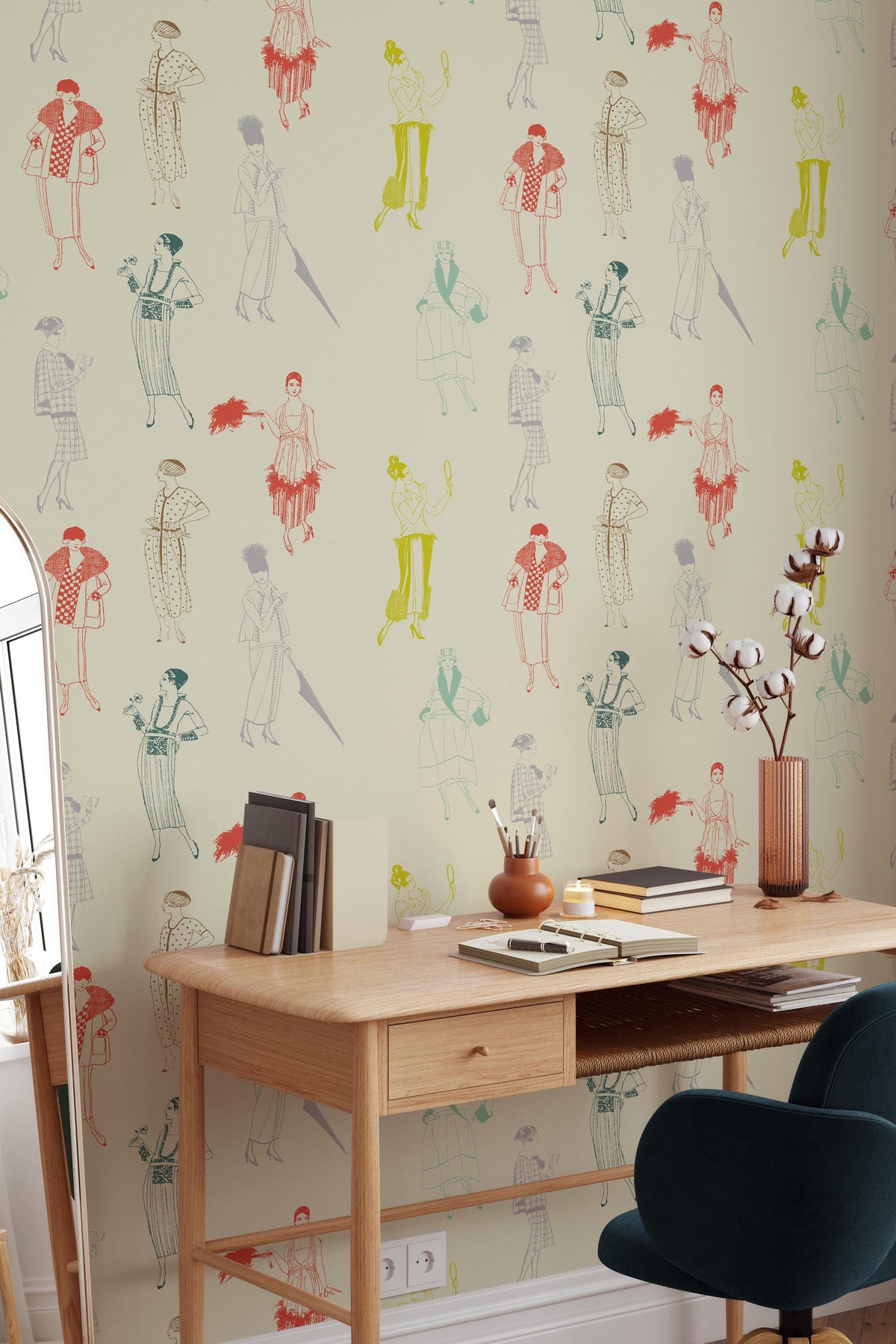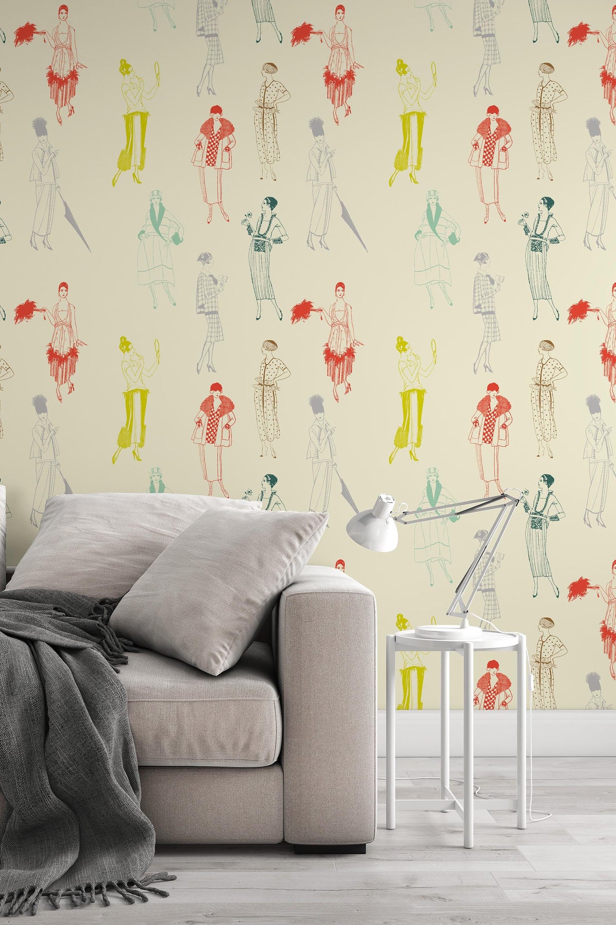 Illustrative wallpaper featuring vintage fashion silhouettes inspired by 1920s style. Light graphic linework, a muted color palette, and a refined retro feel make this design a distinctive yet subtle interior accent.