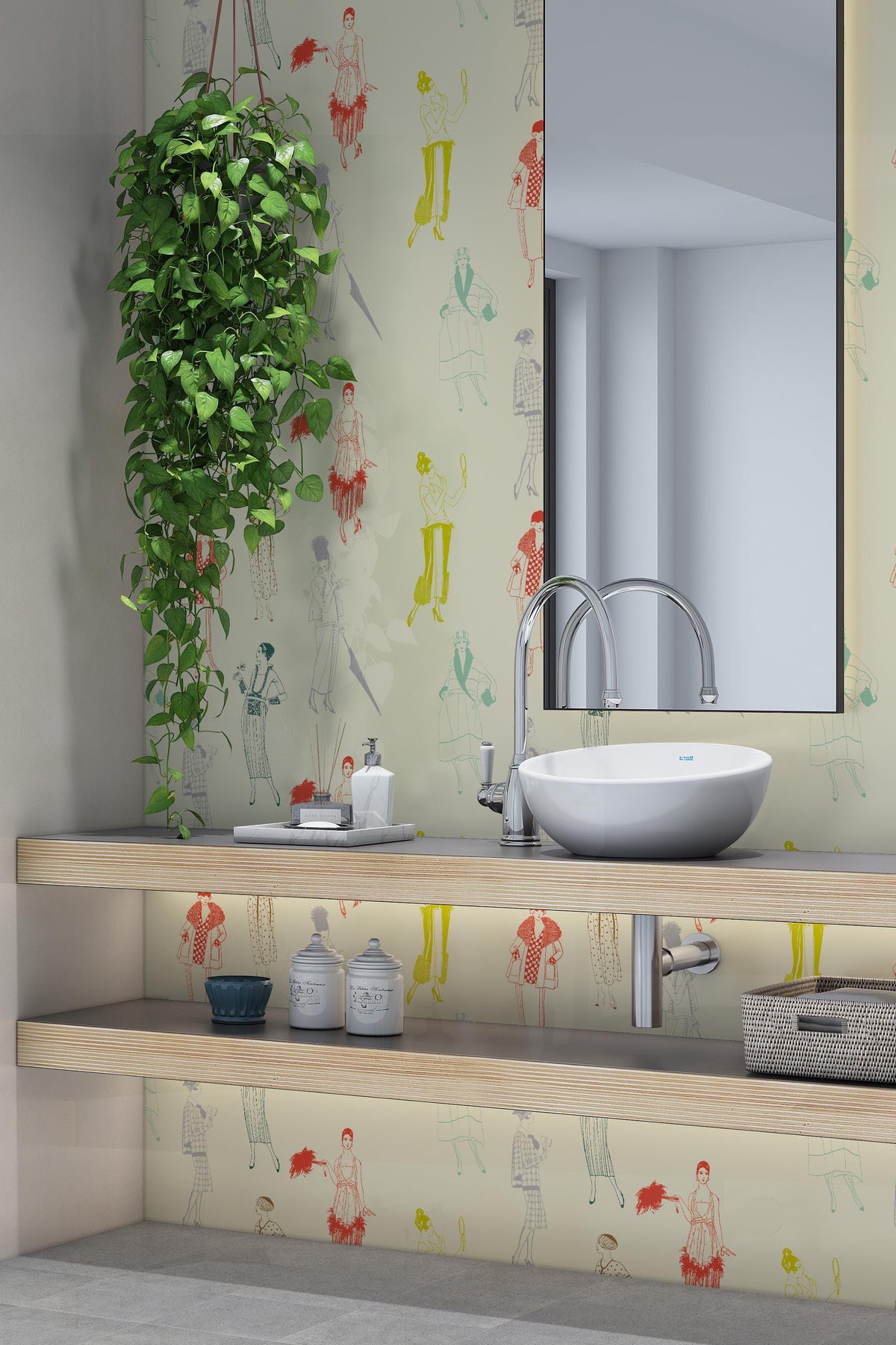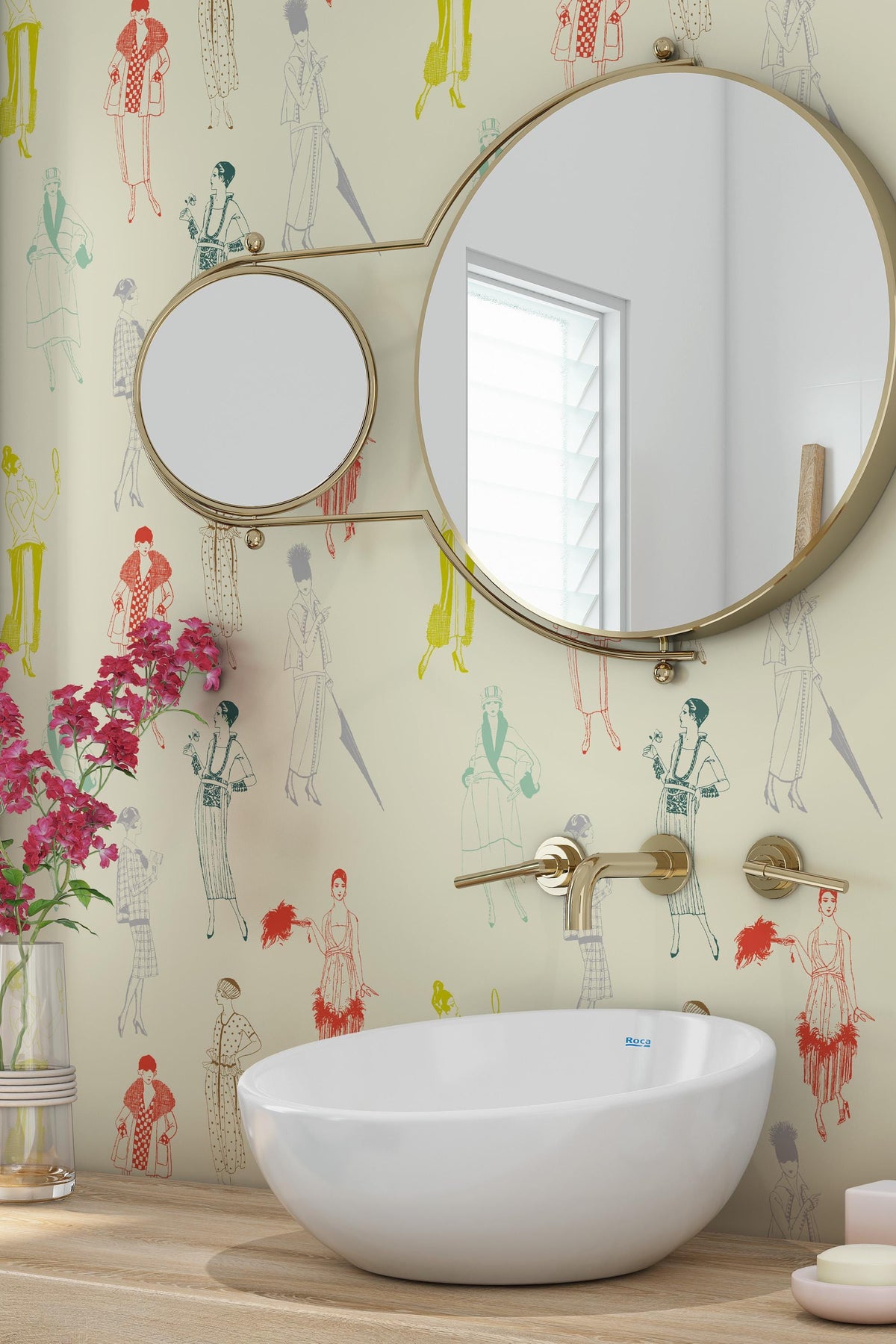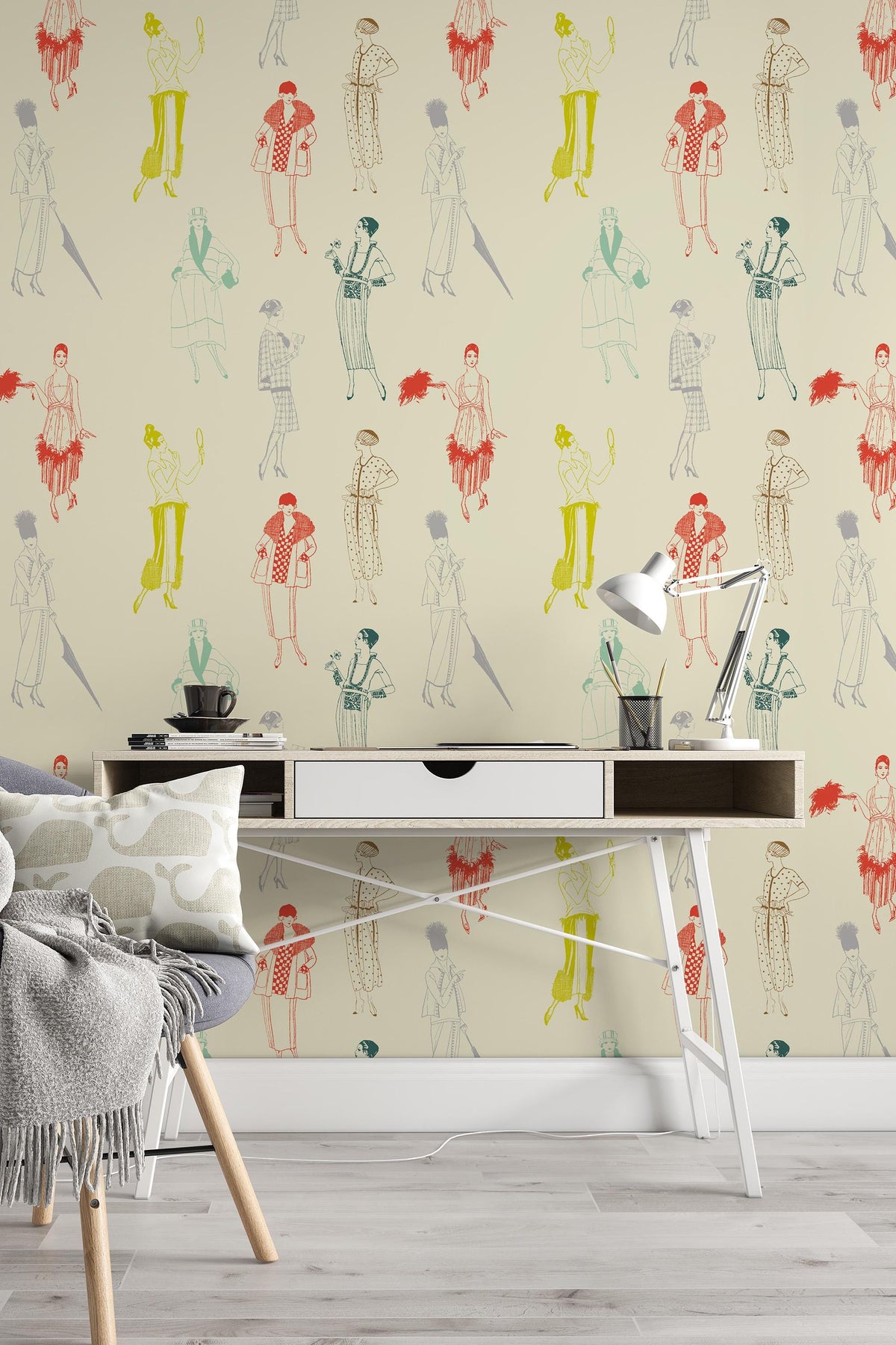 Illustrative wallpaper featuring vintage fashion silhouettes inspired by 1920s style. Light graphic linework, a muted color palette, and a refined retro feel make this design a distinctive yet subtle interior accent.