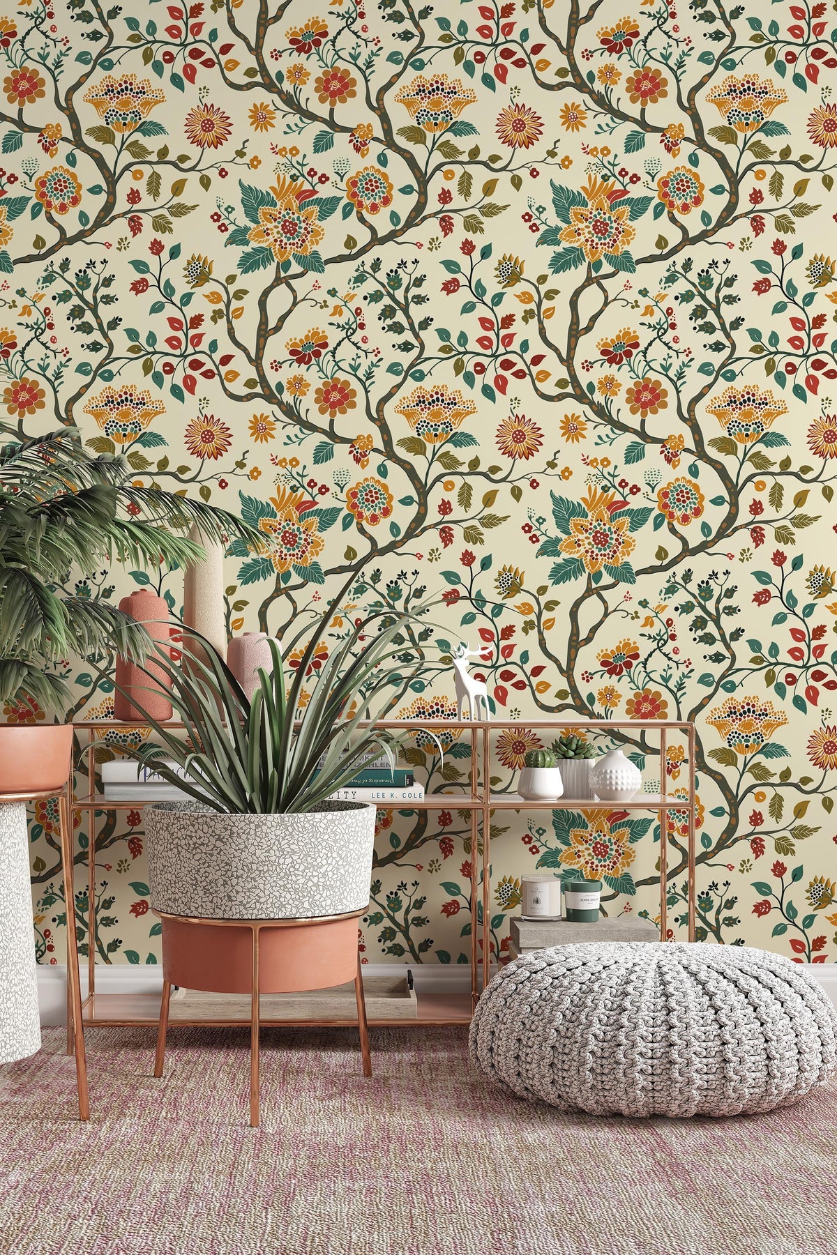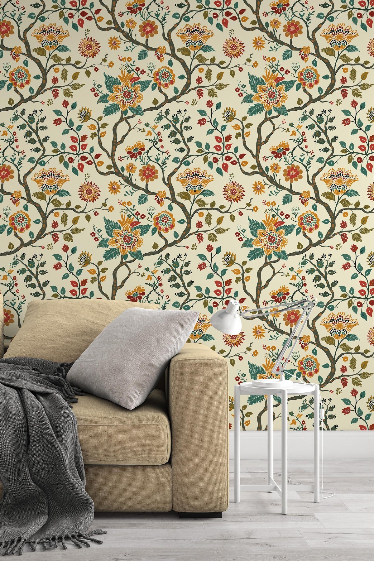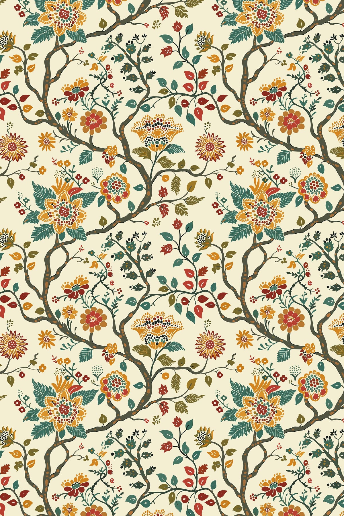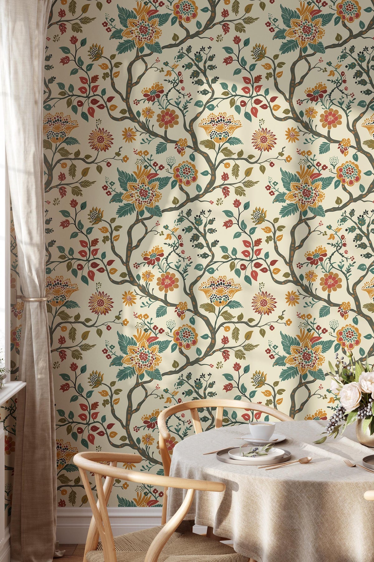 Decorative floral wallpaper with flowing branches, stylized leaves, and intricate blossoms inspired by classic folk and botanical motifs. Warm earthy tones and balanced detail create a cozy, timeless look that works beautifully in both traditional and modern interiors.