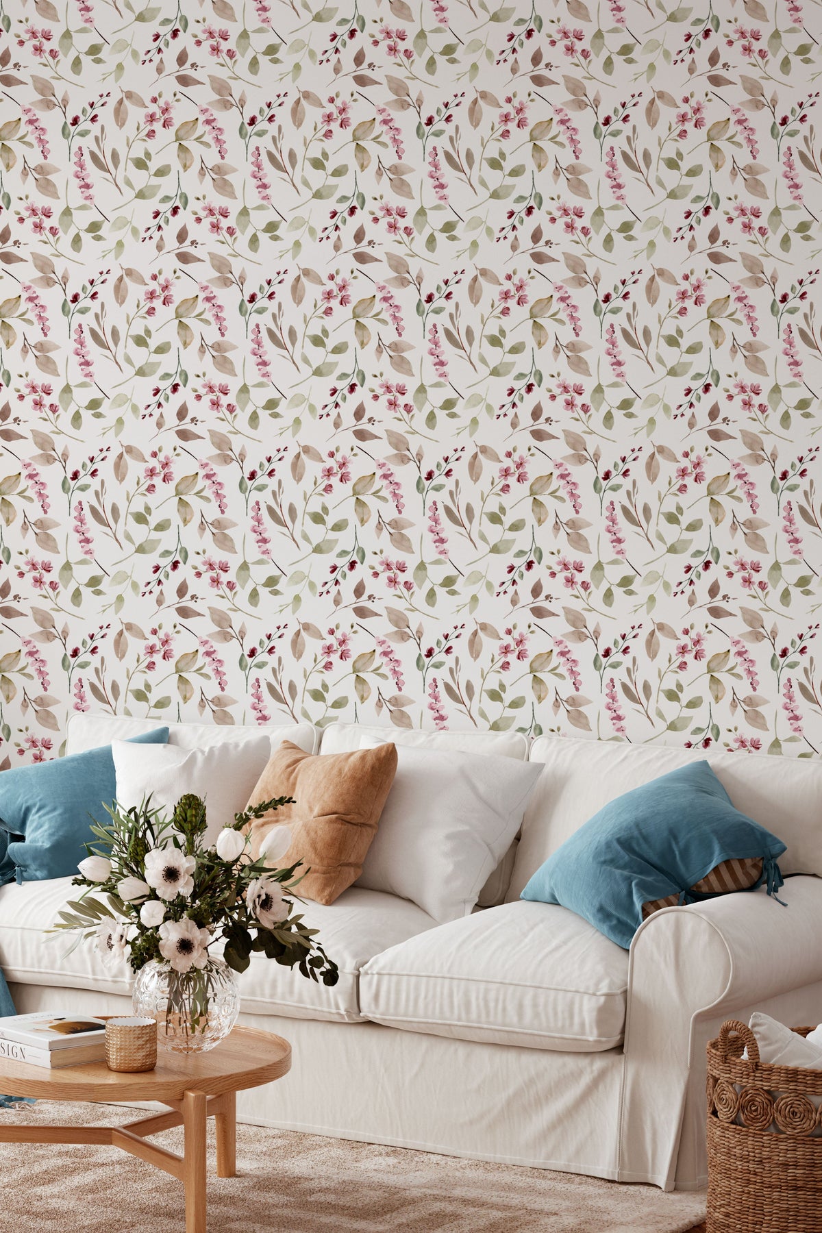 Soft botanical wallpaper with watercolor leaves and flowers. Features pink, burgundy, and green tones on an pale grey base. Delicate and organic, perfect for calm, creative spaces.